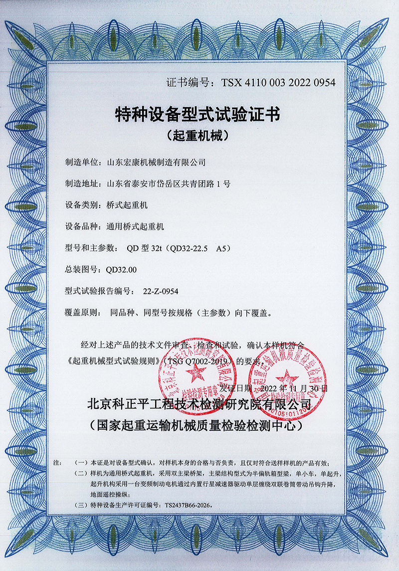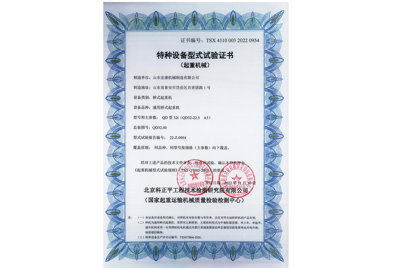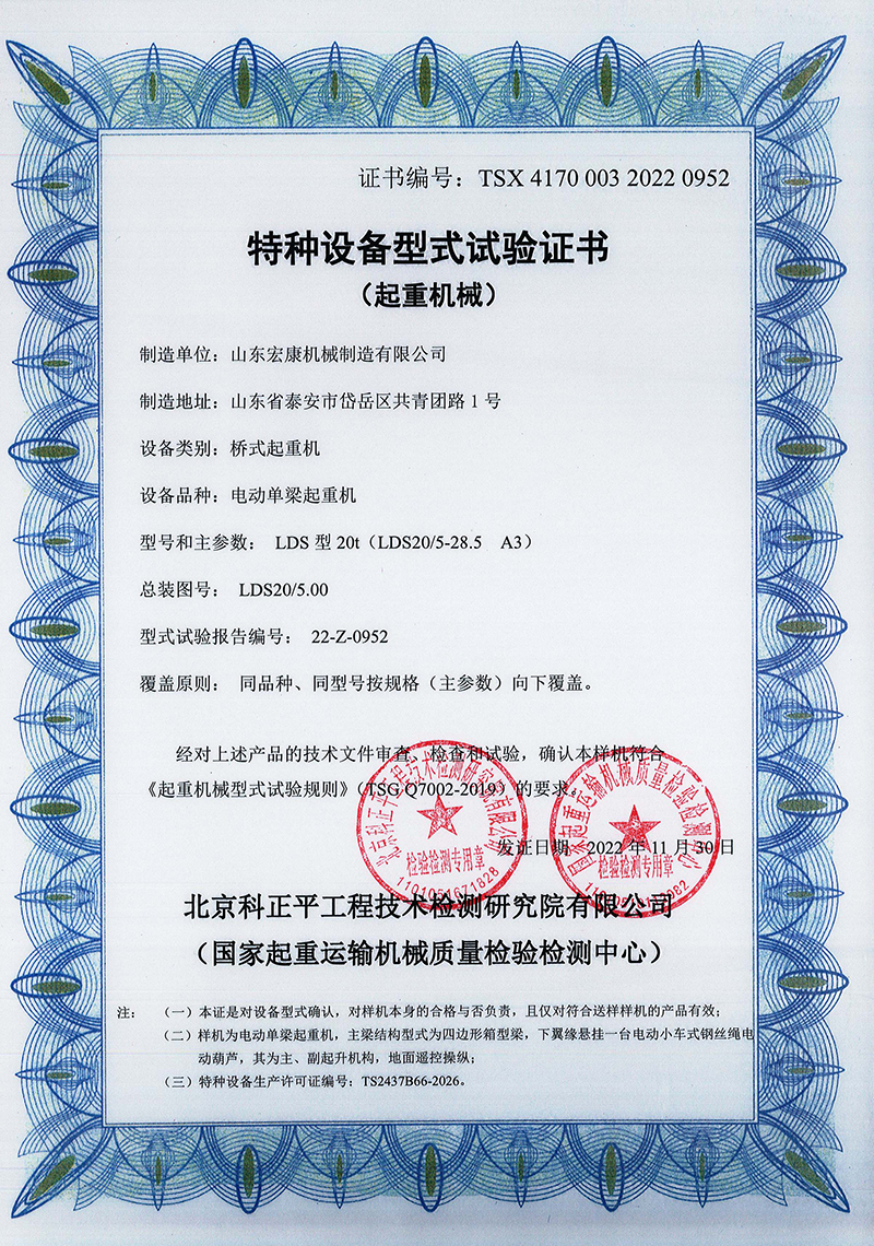 電動(dòng)單梁橋式起重機(jī)型式試驗(yàn)合格證