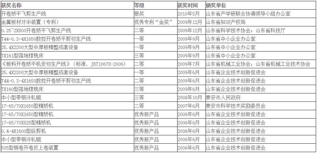 “T44-5~25.4×2200開(kāi)卷矯平移動(dòng)剪切生產(chǎn)線”入選“2010年度中國(guó)國(guó)內(nèi)首臺(tái)套技術(shù)裝備示范項(xiàng)目”,“大型數(shù)控中厚板精整成套設(shè)備產(chǎn)業(yè)化項(xiàng)目”被列入2011年山東省自主創(chuàng)新成果轉(zhuǎn)化重大專項(xiàng)計(jì)劃;